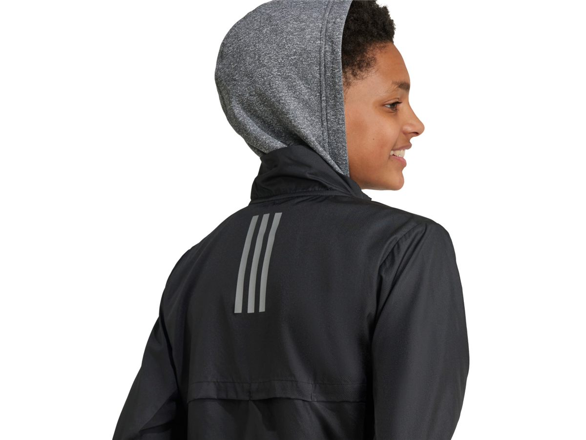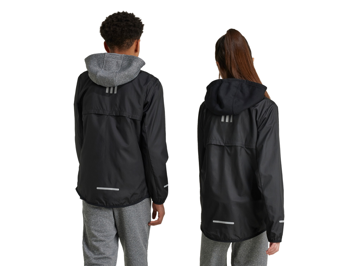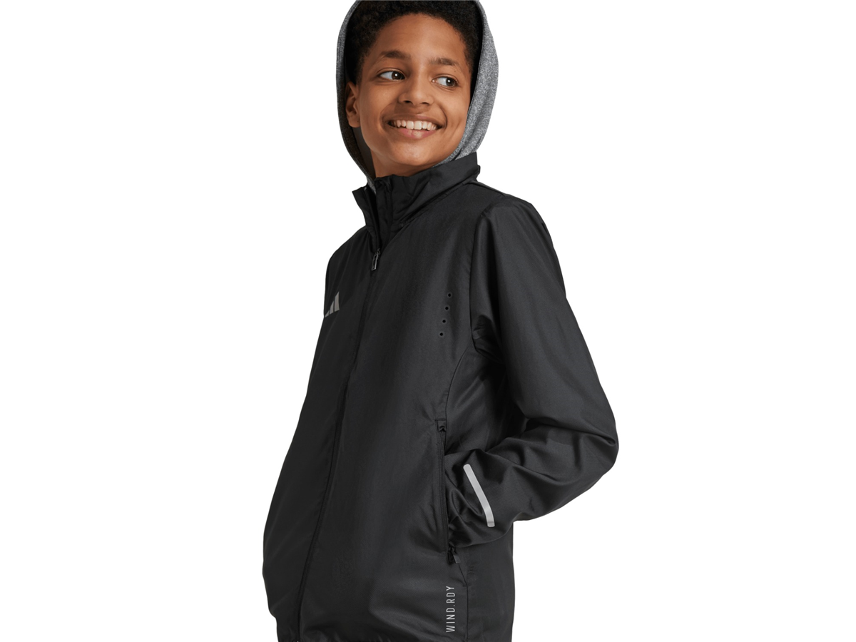 Great for outdoor activities, this juniors' adidas jacket shields against wind and light rain while remaining breathable. The minimal design works well with sports gear or casual outfits, depending on what you're up to. WIND.RDY technology guards against blustery weather while reflective details keep you visible when the daylight fades. This product is made with 100% recycled materials. By reusing materials that have already been created, we help to reduce waste and our reliance on finite resources and reduce the footprint of the products we make.