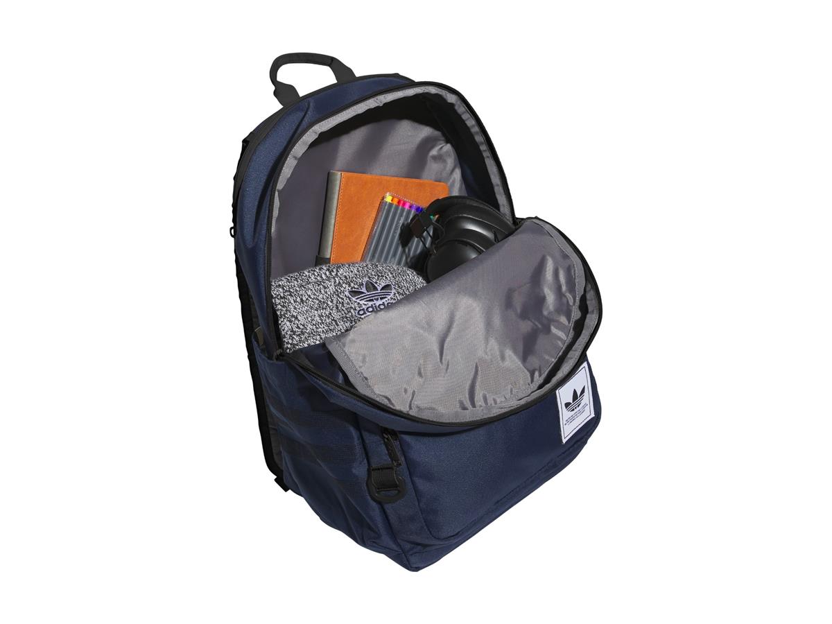 Large zippered main compartment Multiple smaller zippered compartments Side pockets Padded and adjustable shoulder straps Top carrying handle The adidas Originals Premise Backpack is imported. Carry all of your stuff in style with the adidas Originals Premise Backpack. It has multiple zippered compartments so you can keep all of your essentials organized.