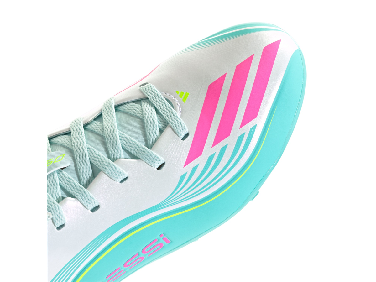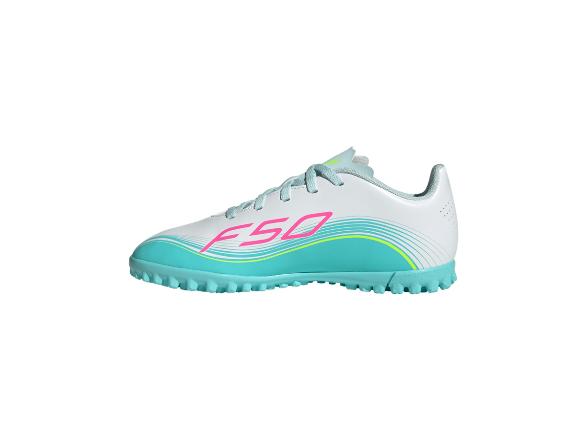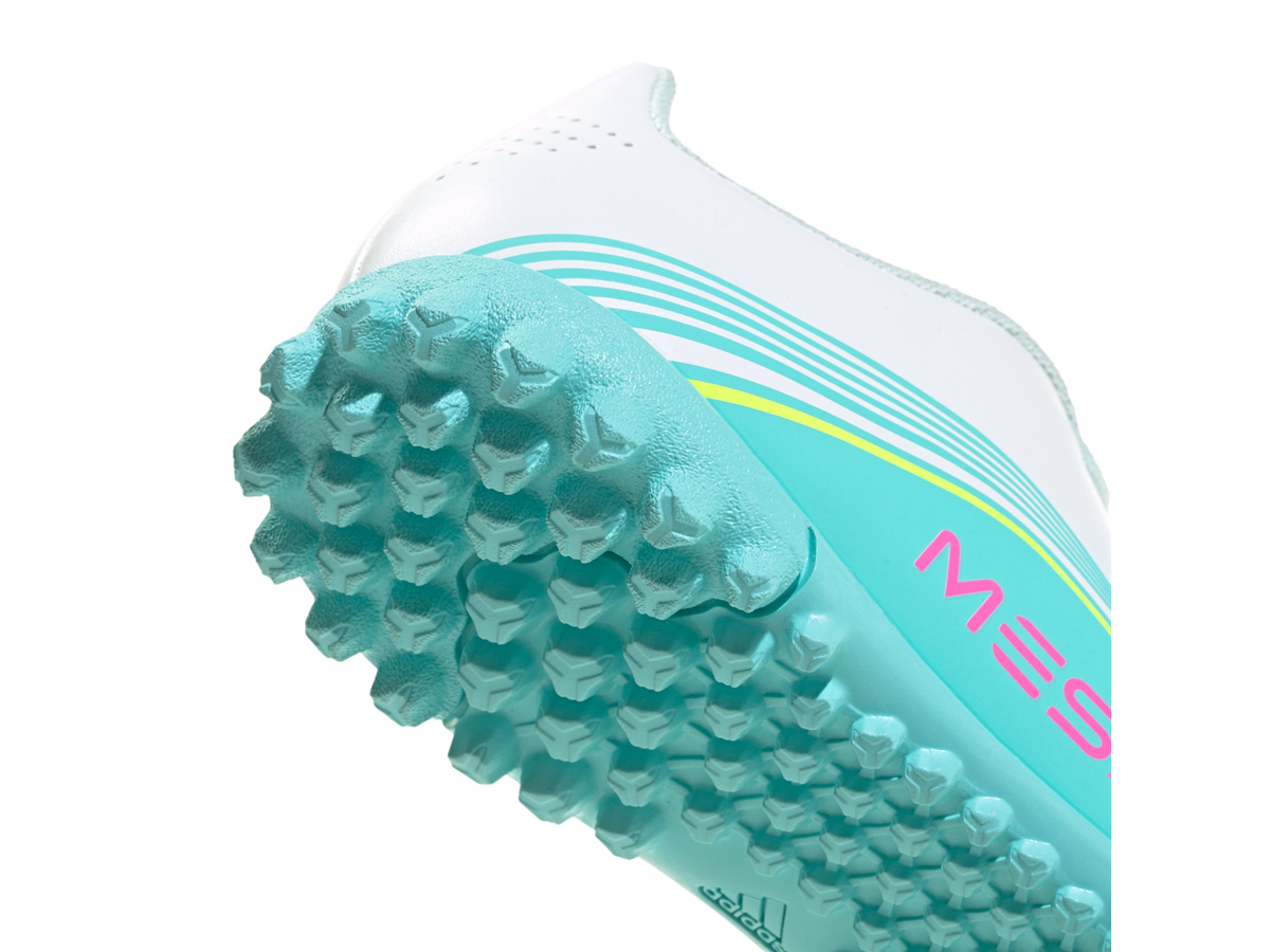 Let your little one experience the thrill of football with the F50 Messi Club Turf Football Shoes. Inspired by Messi's preferences, they are designed to feel light and soft on the feet, helping kids move with game-changing speed. Crafted with a lightweight synthetic upper, these shoes provide support and cushioning for active kids. The lace closure allows for a secure fit, offering comfort and stability on the pitch. The rubber outsole is specifically developed for turf pitches, offering optimal traction and grip on short-bladed synthetic fibres. The synthetic floating tongue with punch holes provides extra breathability, keeping little feet cool during playtime. With the iconic Messi branding and adidas logo, these shoes are a smart pick for young football enthusiasts who aspire to play like their hero. Let your child begin their football journey with confidence and style, knowing they're equipped with shoes that support their every move.