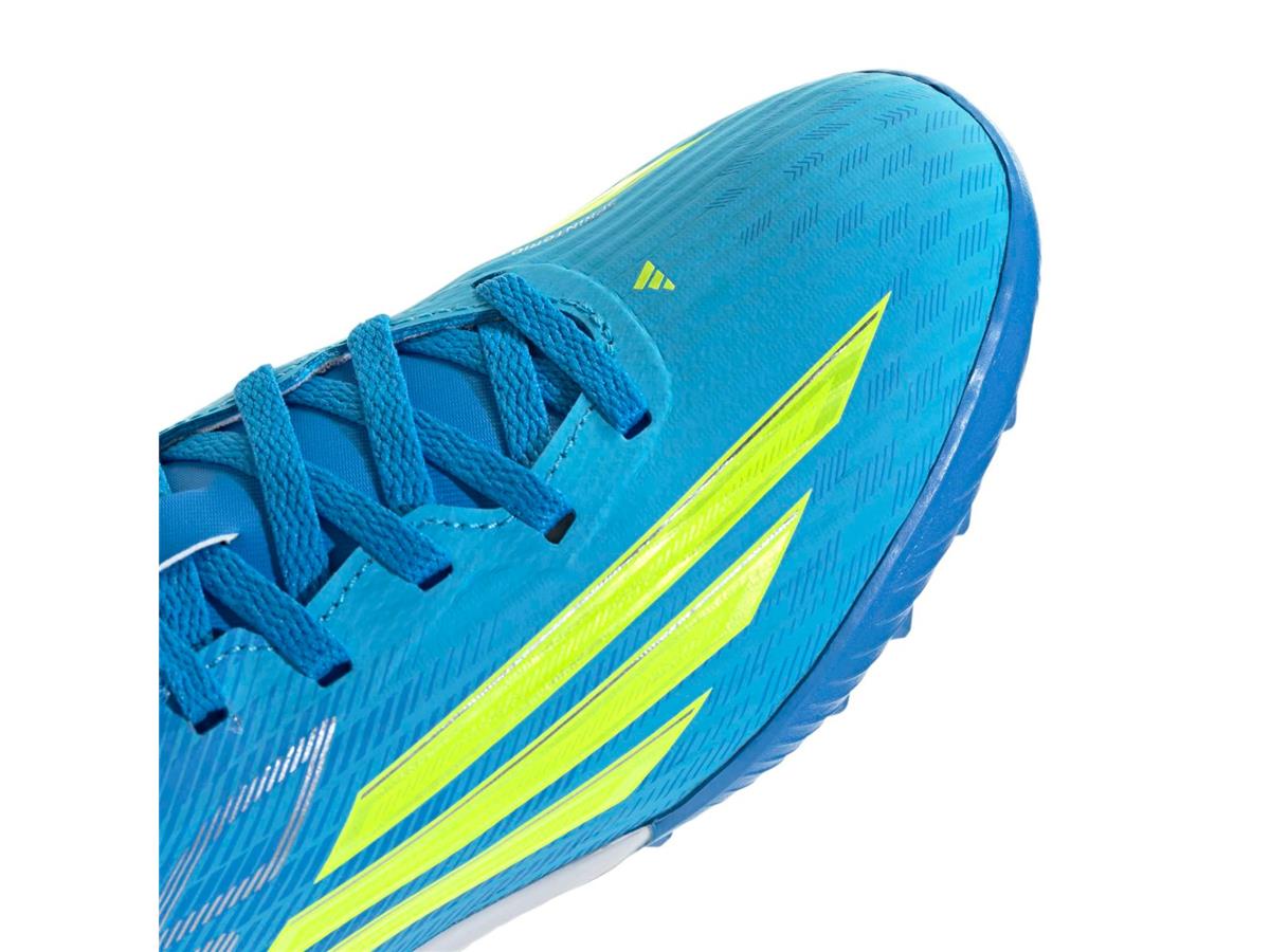 When it comes to football, the F50 League Turf Football Shoes are designed to keep young players at the top of their game. With a refreshed upper graphic and precision engineering, these shoes are all about speed and performance. The Fiberskin Upper, crafted with engineered mesh and strategically placed 3D lines, enhances ball touch and provides a fast visual appeal. The synthetic floating tongue adds comfort and breathability, delivering a lightweight feel. Designed for turf pitches, the rubber outsole offers optimal traction, allowing kids to play confidently on astro turf and artificial pitches. The Sprintgrid features a 2D mudguard print that visually echoes design elements from adidas’ pinnacle models. Built for speed and agility, these lightweight shoes give young players the support to move with confidence. Every match becomes an opportunity to play their best with adidas by their side.