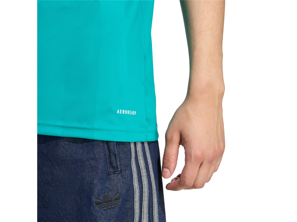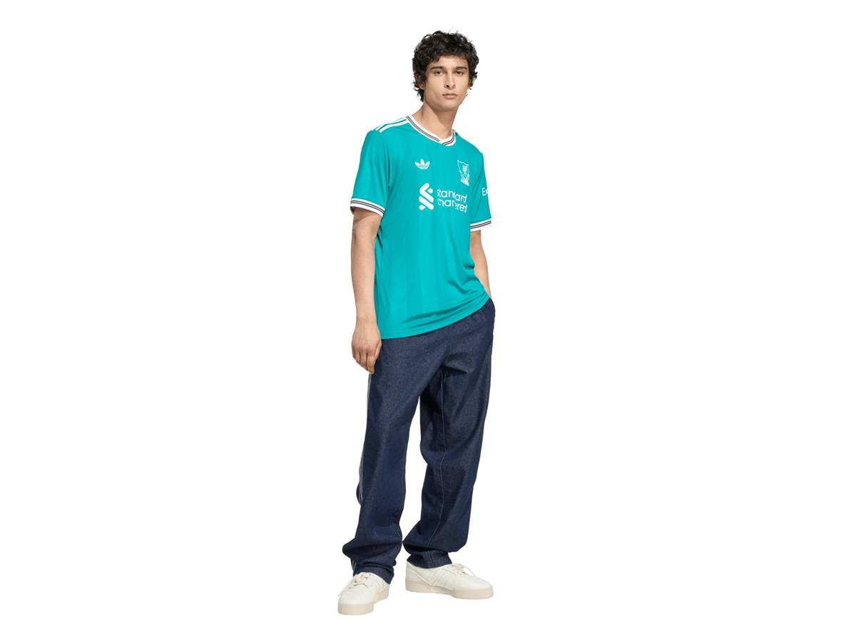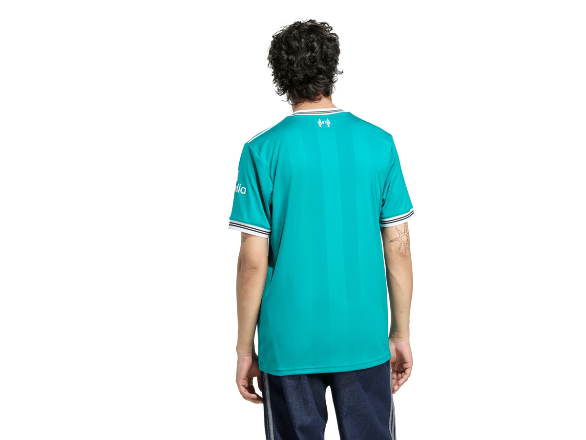 A modern football classic inspired by Liverpool FC's storied 3-Stripes history. The tonal vertical stripes on this elegant third jersey come in unmistakable adidas Equipment green. On the chest, that vintage club badge shares the spotlight with a Trefoil for the first time since 1991. Created for travelling Reds, this shirt includes moisture-managing AEROREADY so it feels as good as it looks.