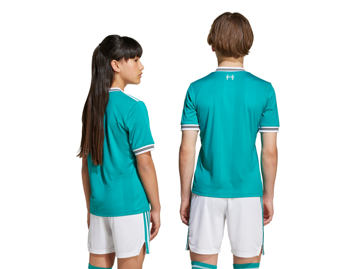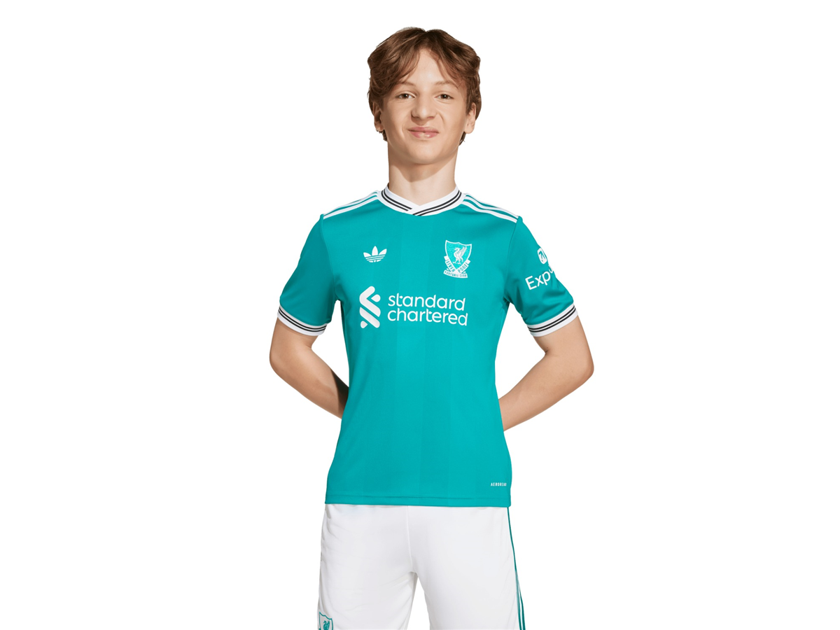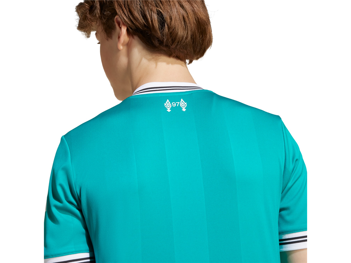 A modern football classic inspired by Liverpool FC's storied 3-Stripes history. The tonal vertical stripes on this juniors' third jersey come in unmistakable adidas Equipment green. On the chest, that vintage club badge shares the spotlight with a Trefoil for the first time since 1991. Created for travelling Reds, this shirt includes moisture-managing AEROREADY so it feels as good as it looks.
