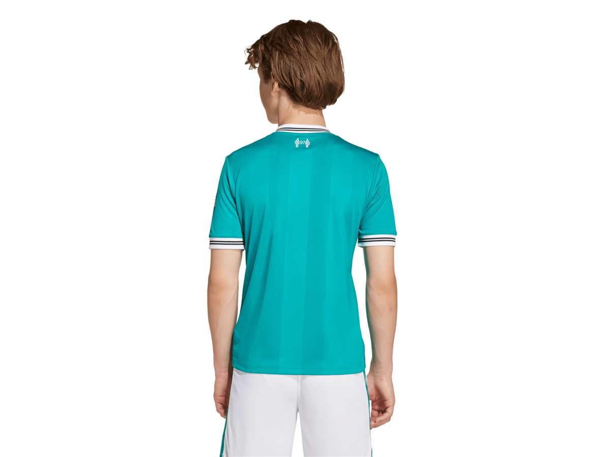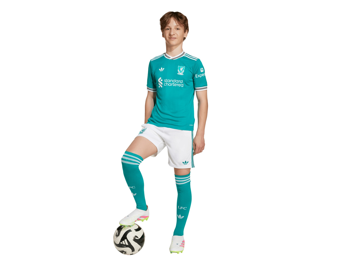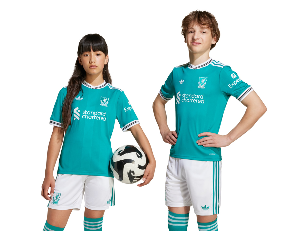 A modern football classic inspired by Liverpool FC's storied 3-Stripes history. The tonal vertical stripes on this juniors' third jersey come in unmistakable adidas Equipment green. On the chest, that vintage club badge shares the spotlight with a Trefoil for the first time since 1991. Created for travelling Reds, this shirt includes moisture-managing AEROREADY so it feels as good as it looks.
