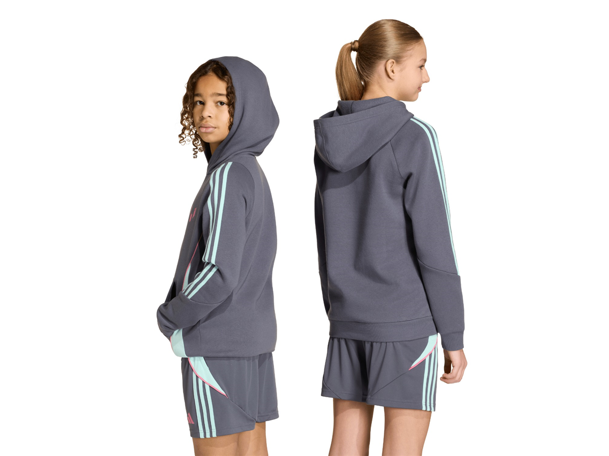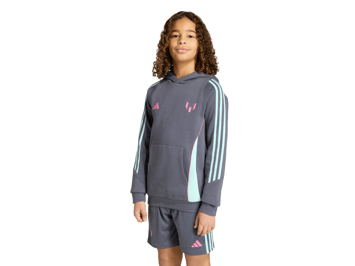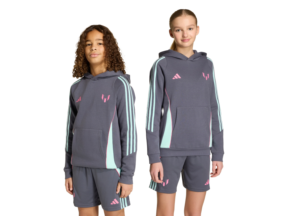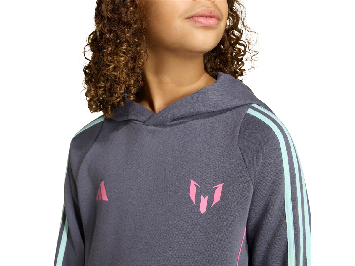 Represent the beautiful game's greatest player. Showing off Messi's iconic logo on the chest, this juniors' adidas hoodie keeps young fans comfortable with soft fleece fabric, a roomy hood and a kangaroo pocket. Pull it on over your favourite team jersey to show you appreciate the finer things in football.