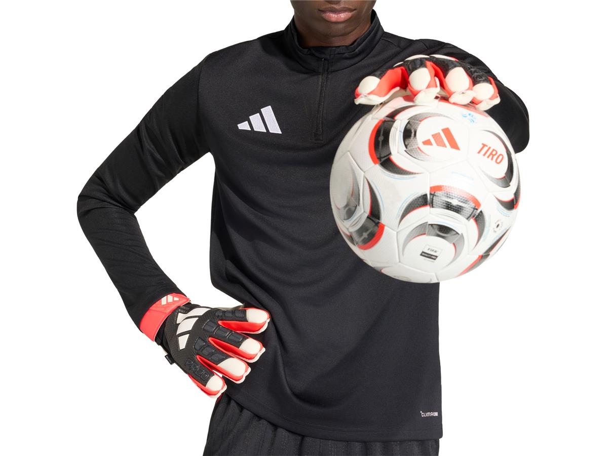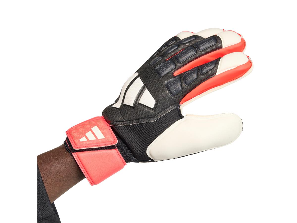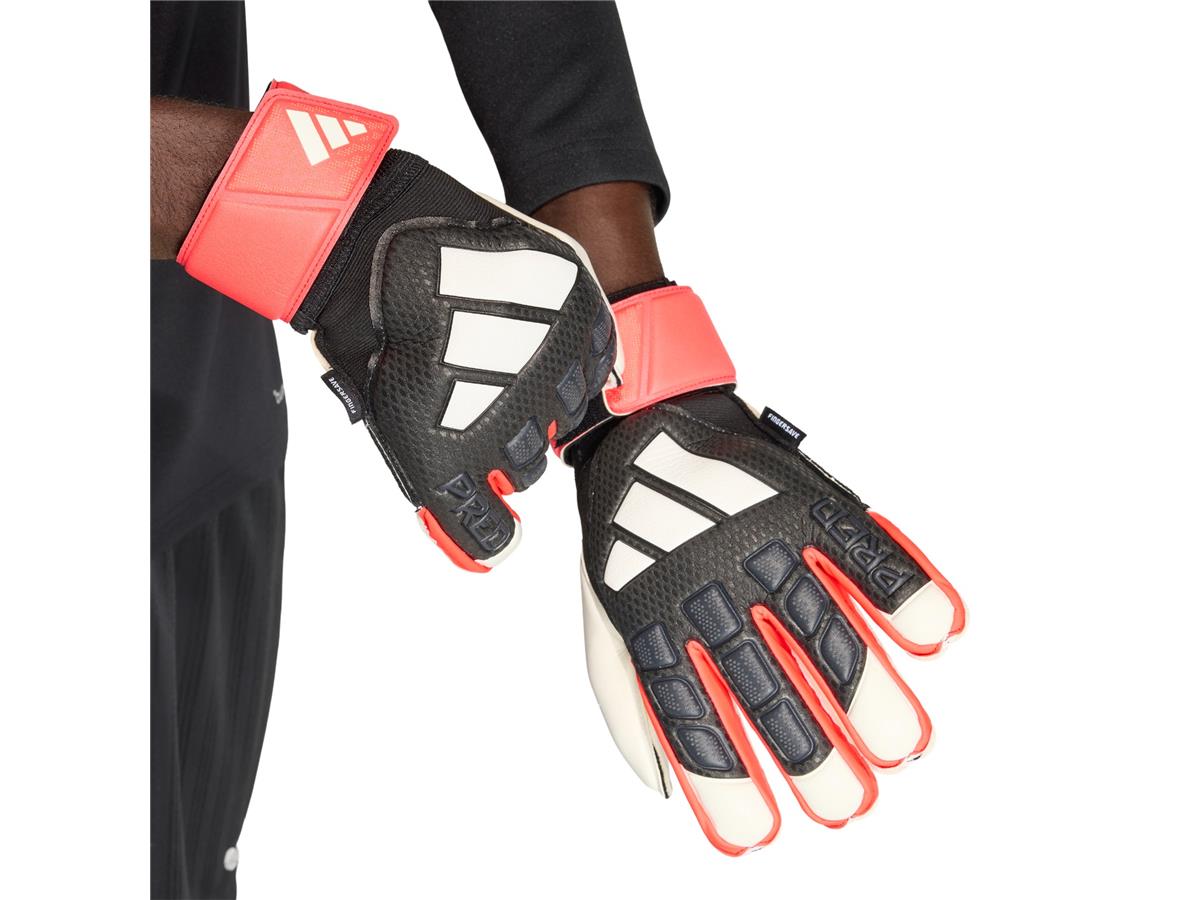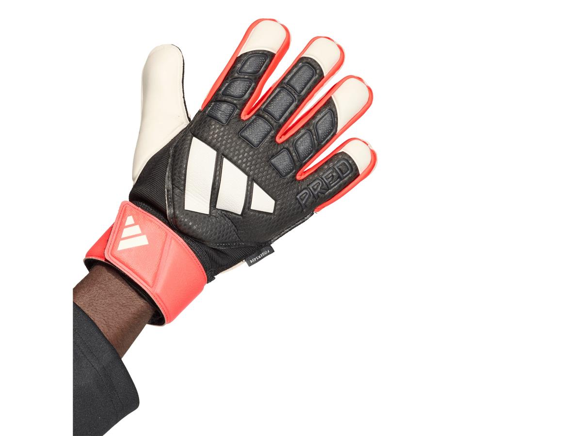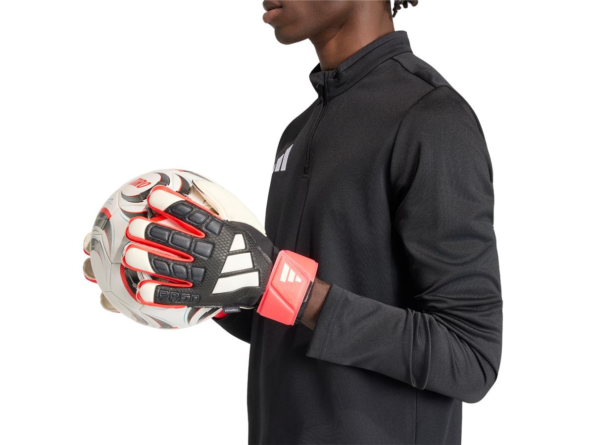 Command your area in these Predator Match Fingersave Goalkeeper Gloves. Designed to give you confidence from your first touch, they have a grippy, cushioned Soft Grip Pro palm. Fingersave technology stiffens the fingers to add support to parries, catches and throws. The lightweight half-wrap wrist strap delivers a secure fit that you can rely on. A positive cut on the fingers offers a roomy fit with enhanced ball contact area, while the mesh and latex backhand provides comfort and added flexibility. When it’s all on you, these adidas football gloves are designed to back your instincts and help you deliver on the pitch.