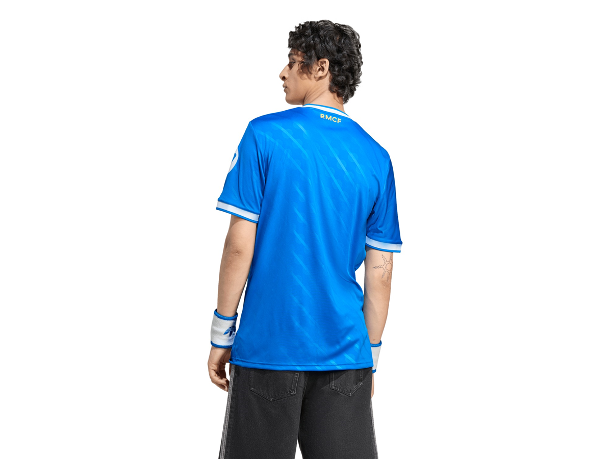 At home in blue. This Real Madrid third jersey comes in a hue that's close to the hearts of Madridistas and 3-Stripes fans. A classic adidas Originals colourway and a subtle nod to the Bernabéu's identity, it's the perfect shade to celebrate the ultimate football partnership. Serrated 3-Stripes and a Trefoil add extra adidas heritage. Moisture-managing AEROREADY keeps fans focused.