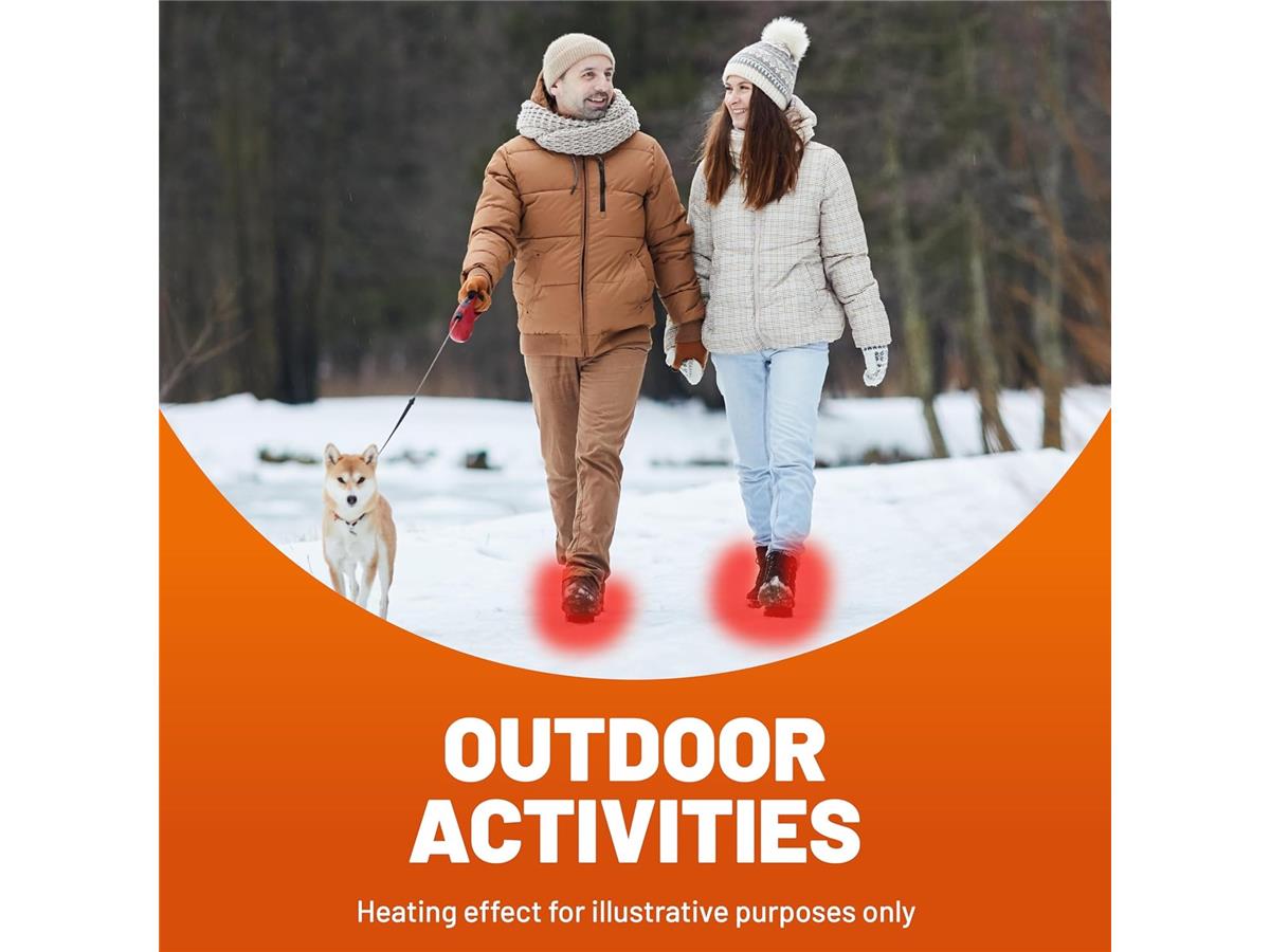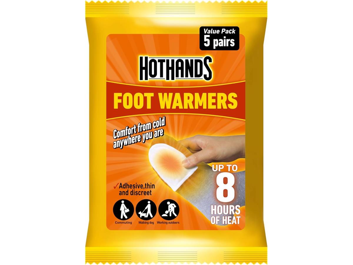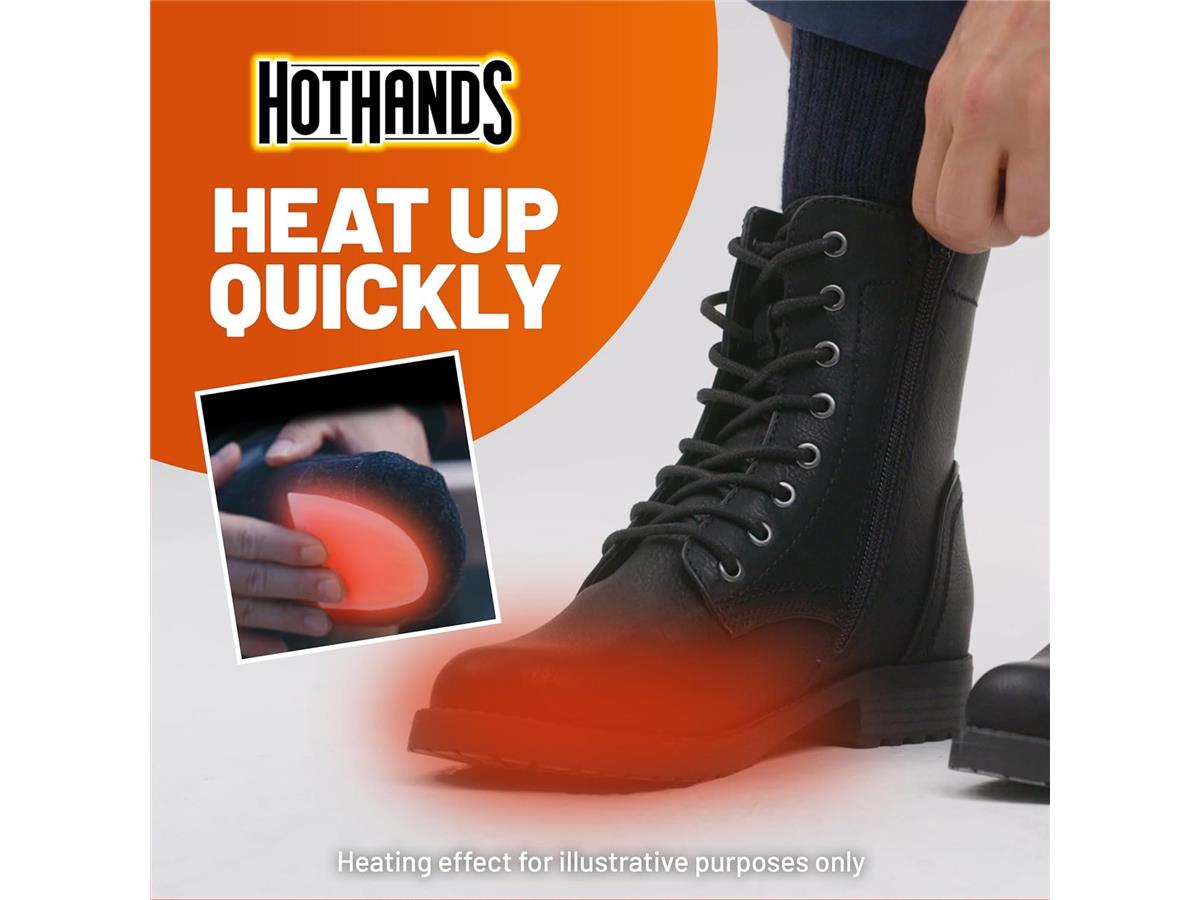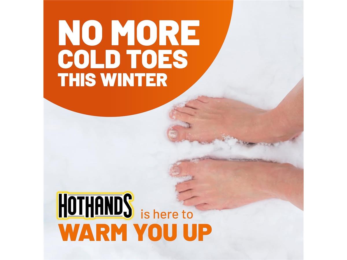 Hothands Toe Warmers are single-use air-activated heat packs that provide up to 8 hours of continuous warmth for the toes.